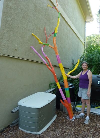 Debold's advice to others is to always follow your curiosity, which shown in her sculpture, Imagination. This 10 foot sculpture is part of a collection of "Drought Art" where Debold utilized the negative effects of Texas' long droughts to bring something interesting to life. The stainless steal cage located around the brightly colored tree branch signifies the foundations of knowledge and how this limits us in our belief on what is possible. The open sides reference that our perceptions are easily modified with imagination. In this case, Imagination itself is represented by the warm colors of the branches escaping from the box our mind creates. According to Debold, "This piece was an evolution from my interests in art, psychology, and philosophy." As adults, we tend to not use our imaginations as often as we should. While viewing this sculpture, imagine the branches extending further, disrupting the space, and overtaking the steel box surrounding it.